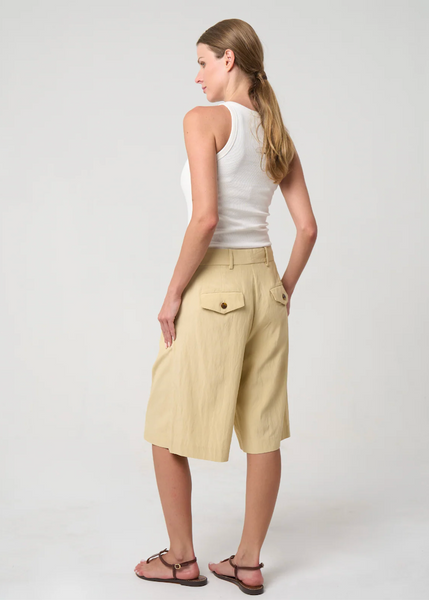 Double-pleated city shorts featuring two back flap pockets with buttons, two side slash pockets, and double belt loop detailing at the front. Material | 70% Rayon, 30% Cotton Care | Dry...