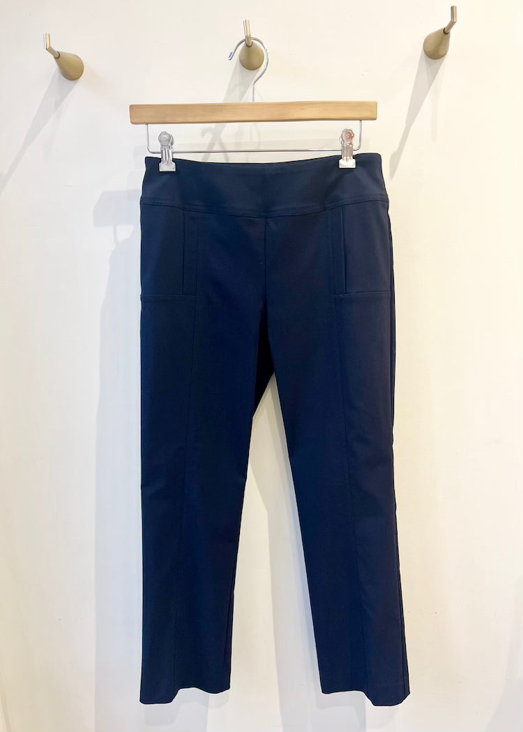 The perfect pull-on style ankle pant that's timeless with a slim-fitting stretch. Flat mid-rise elastic waistband. Elevated in design with a small back slit detail at end of the pant...