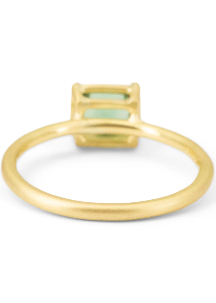 This deep teal green Tourmaline is set in a classic 18k yellow gold mid-profile basket setting. The handcrafted basket setting allows light to shine through and showcase the stunning natural color of the stone.