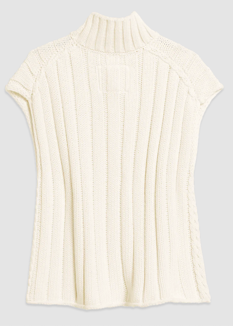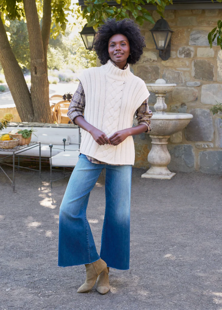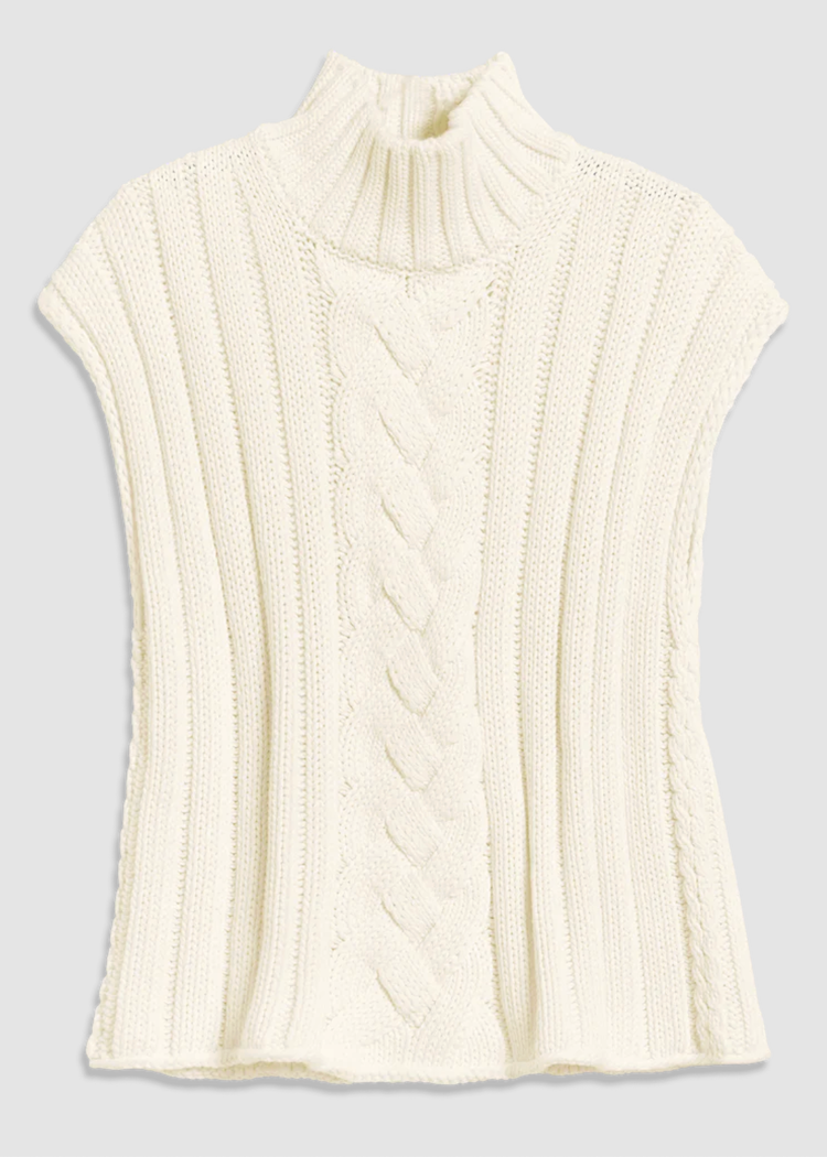 All the countryside feeling of the Cotswolds in one beautifully braided, cable knit vest with a turtleneck. A chunky turtleneck collar adds more warmth to this special sleeveless style, perfect for layering over button-ups and tops for brisk walks and hot ciders amidst England’s rolling hills.