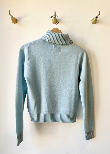 Blue cashmere roll collar with 'distressed' ribs. Founded in 2014 through a shared and genuine love of cashmere. These naturally sustainable cashmere jumpers are made by artisans from the finest...