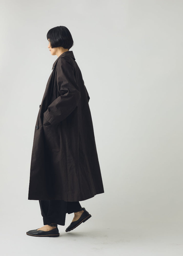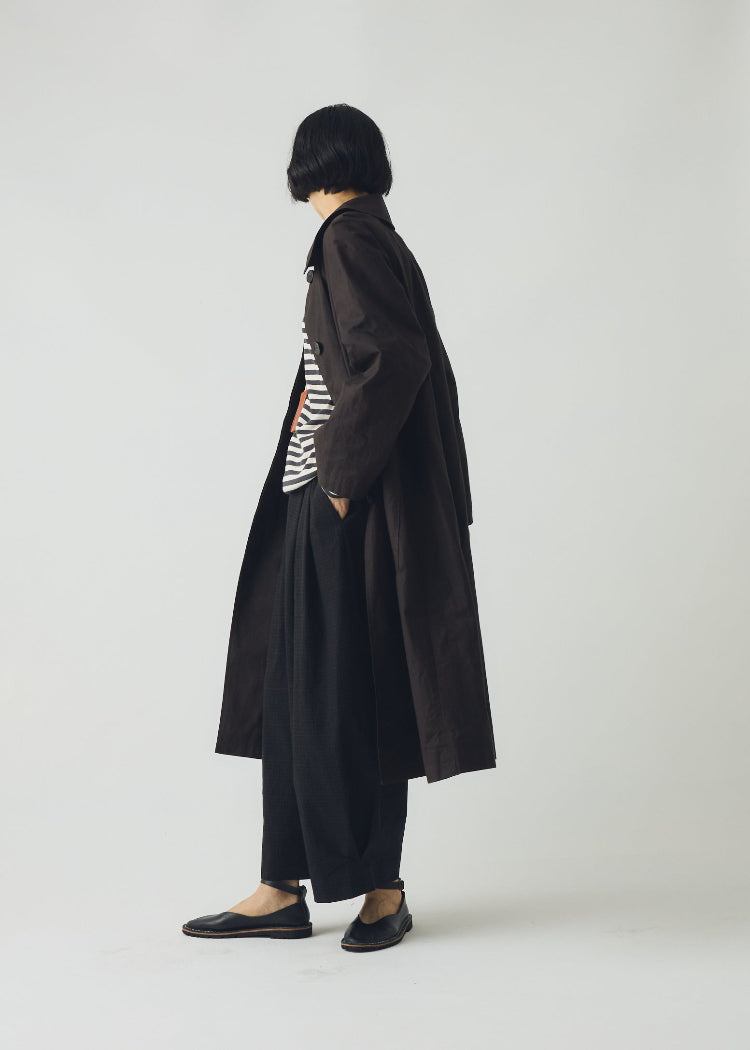 Waxed organic cotton. A-line shape. Fully lined. Raglan sleeves. Large patch pockets. Photographed with the Wide Leg Check Cotton Wool Trousers.