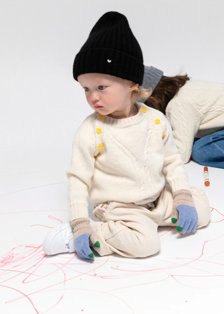 The thumb and index finger tips are designed in contrasting colors to help kiddos know their left from their right. Some colors have a sewed-in joint strap string (color matched to the thumb and index finger tips).