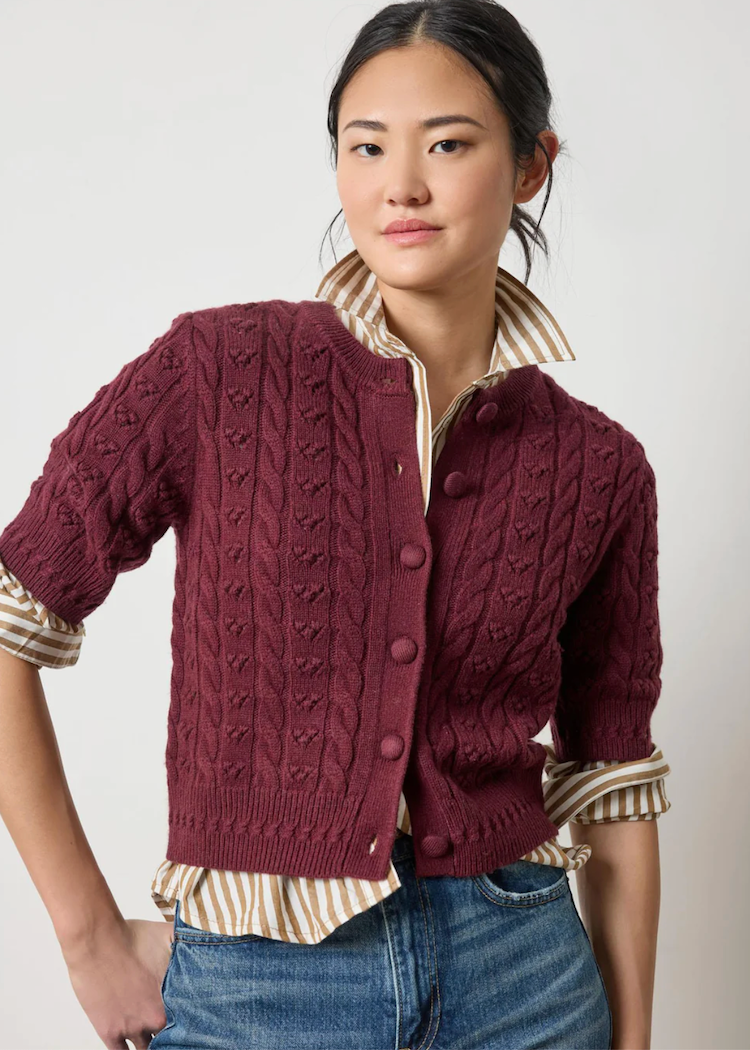 The Short Sleeve Cardigan Sweater in a Luxe Cashmere Blend is soft, cozy, and eco-friendly. This luxurious yarn holds stitches beautifully, highlighting the intricate stitch details and delicate self-covered buttons. Worn alone or layered over a crisp Poplin button-down, it pairs perfectly with your favorite denim for an elevated yet easy look.