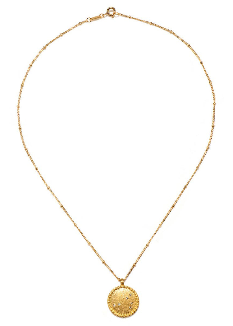 We are all linked by our femininity; our shared sisterhood is an infinite source of uplift and strength. An 18k gold plated pendant necklace glimmers with white topaz—stone of individuality, creativity and awareness—in the design of the constellation Pleiades, or seven sisters—known for their beauty and harmony.