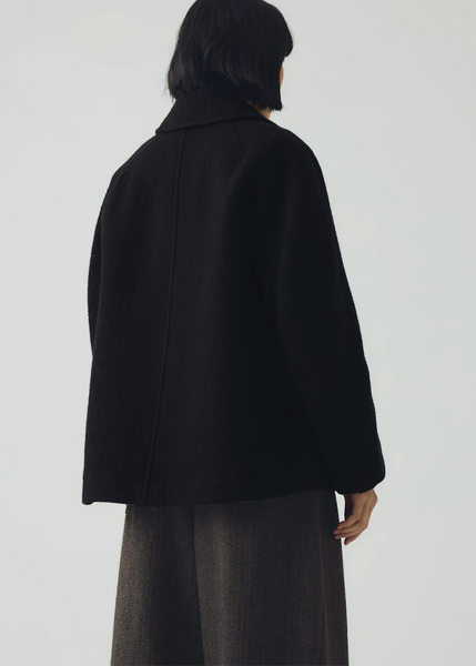 Short coat made from weighty boiled wool blended with cotton and woven in Italy. Featuring a rounded shape, an oversized collar and a concealed front placket, with the top button...